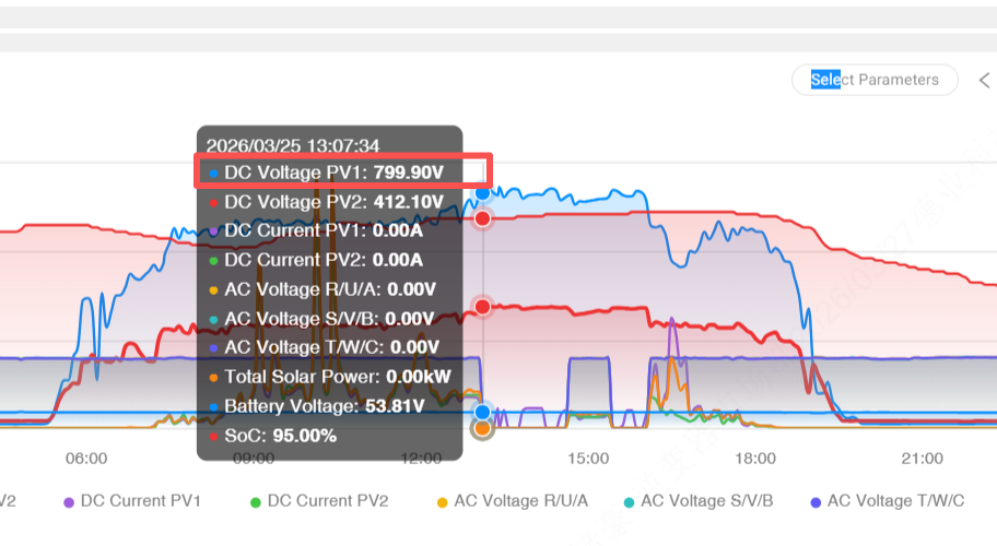 Ce cas est typique : le nombre de séries de chaînes PV1 est trop élevé, de sorte que la tension en circuit ouvert atteint 799,90 V, dépassant largement celle de l'onduleur. ' s entrée autorisée. Sous une forte irradiation, une protection contre les surtensions est inévitablement déclenchée. Certains cas montrent également un déséquilibre entre PV1 et PV2 dans le type de module ou le nombre de chaînes, provoquant un dépassement de la tension de sécurité d'une chaîne.